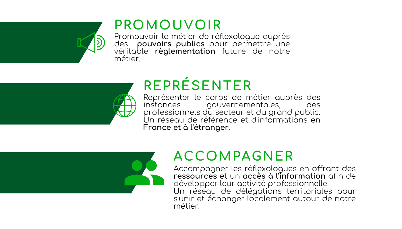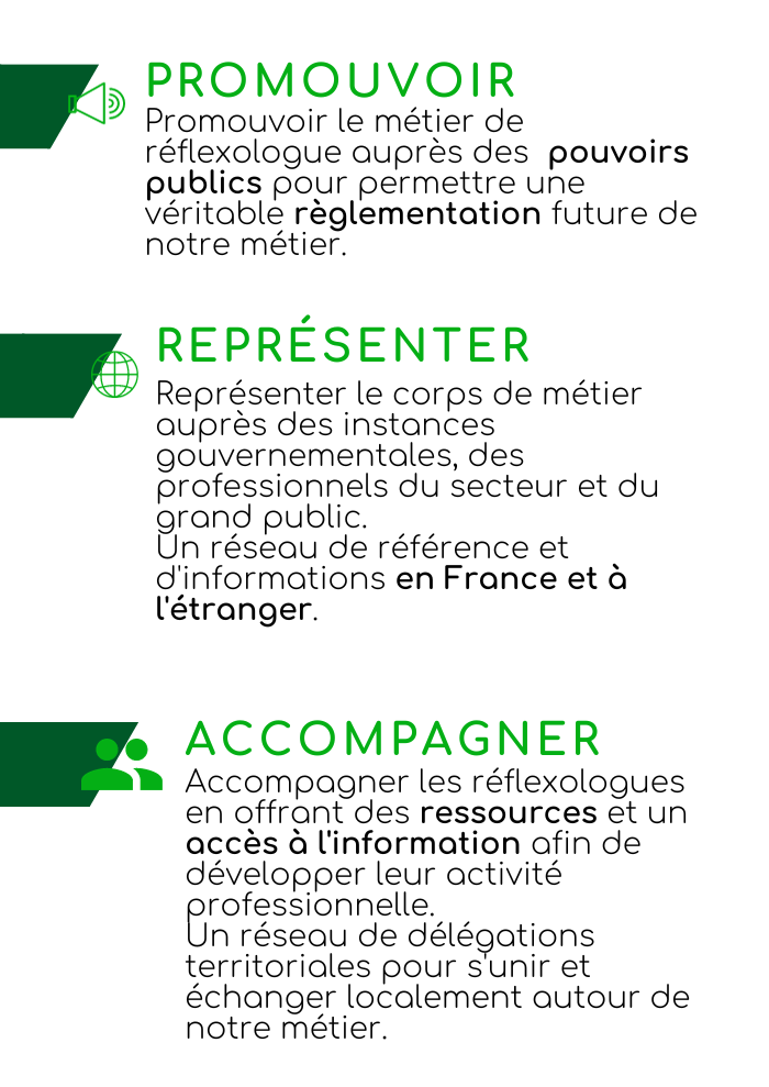 Un.e réflexologue est un.e professionnel.le de la relation d’aide et de l’accompagnement qui s'engage à remplir des fonctions précises, figurant dans la Fiche métier à télécharger.